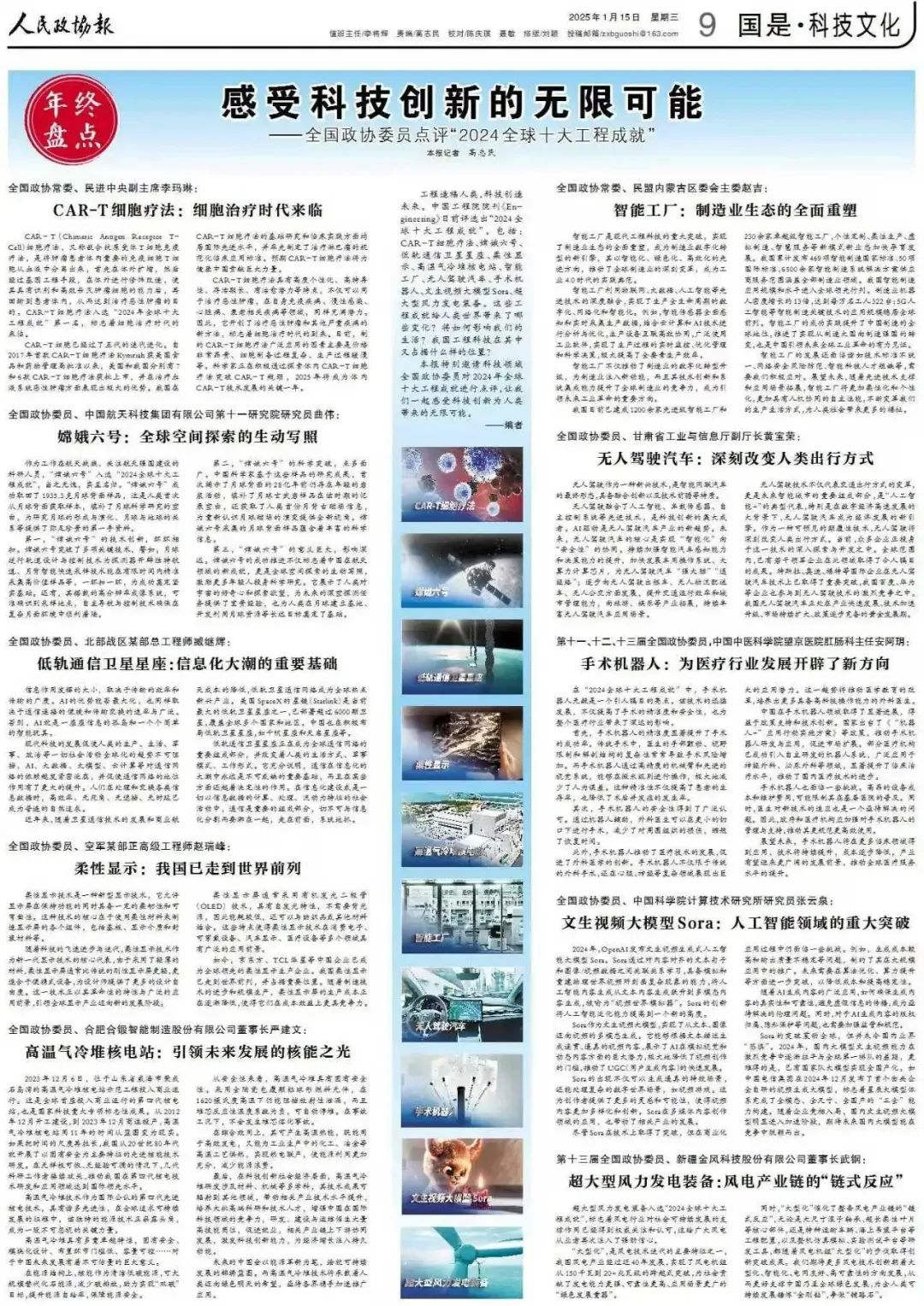 2025年01月15日,人民政协报第 9 版刊登文章《感受科技创新的无限可能——全国政协委员点评“2024全球十大工程成就”》。全国政协常委、民进中央副主席、云南省委会主委李玛琳对CAR-T细胞疗法进行点评:“细胞治疗时代来临”。