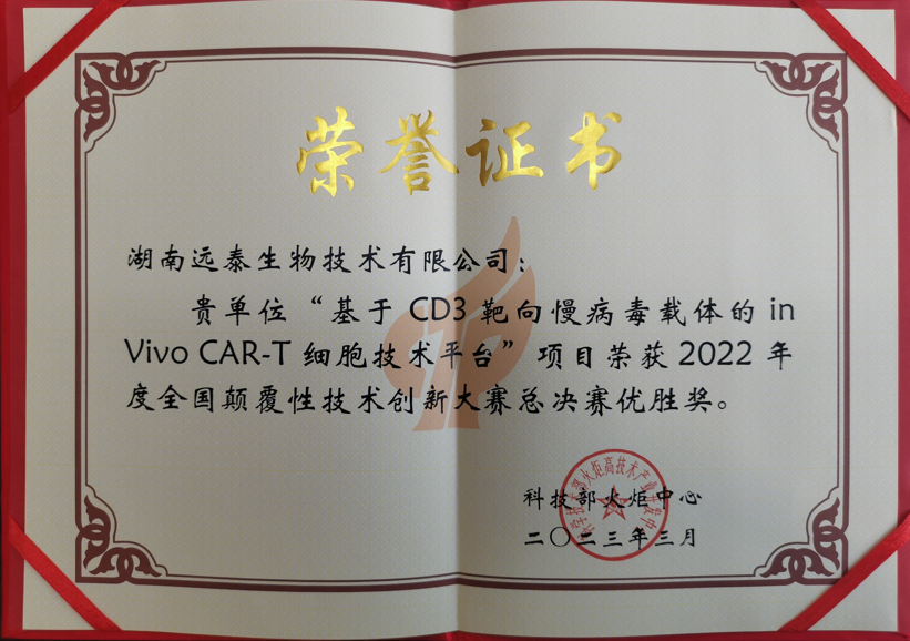 2023年,“基于CD3靶向慢病毒载体的In-Vivo CAR-T细胞技术平台”获国家科技部全国颠覆性技术创新大赛总决赛最高奖-优胜奖;