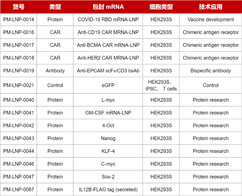 此外,公司为免疫细胞工程研究提供即时可用、高度稳定的mRNA脂质纳米颗粒产品线,通过FACS验证,已经在许多细胞类型中验证了它们的高效性。全面丰富的mRNA-LNP产品线,生产定制的mRNA递送许多不同的基因,可以加速疫苗开发、分子标记、嵌合抗原受体(CAR)、重组抗体、细胞因子、免疫调节剂等领域的研究。